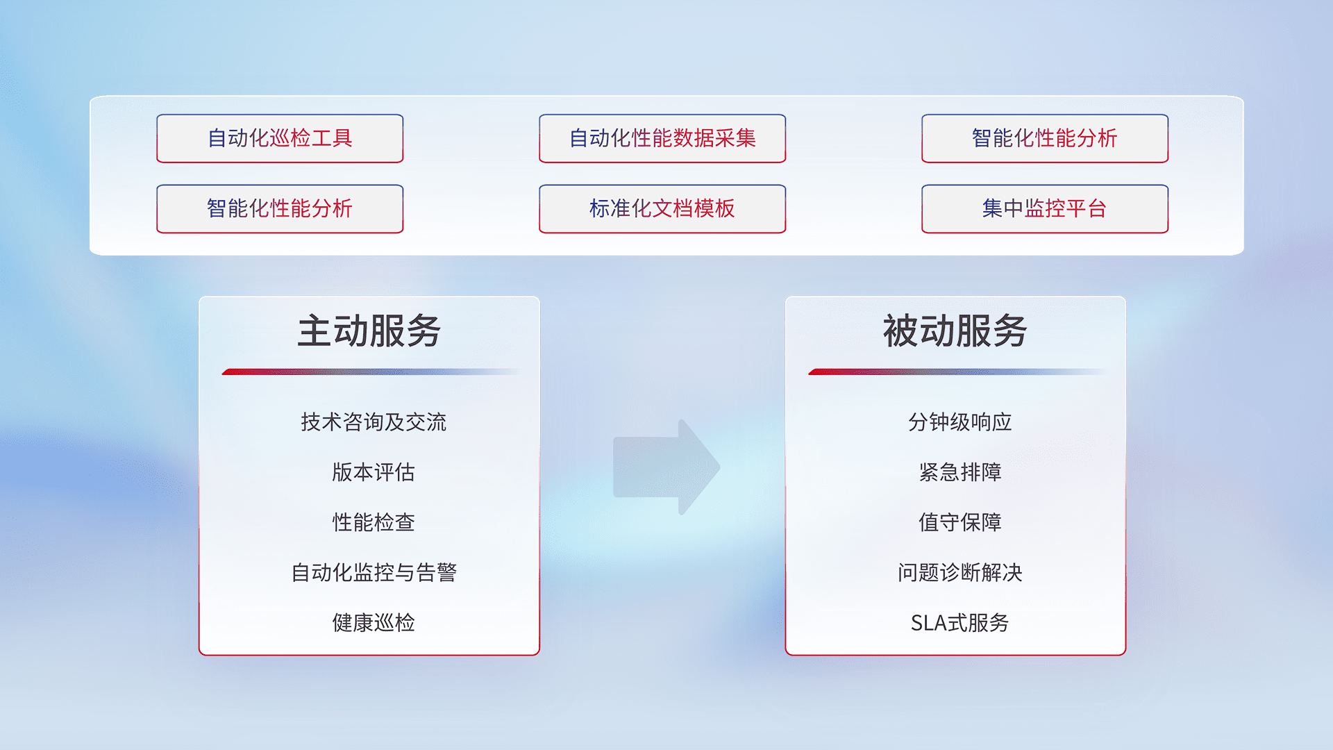 智能化工具和标准化文档,,,,保障服务质量,,提供主动服务(包含技术咨询、、、、版本评估、、性能检查、、、自动化监控与告警、、、、健康巡检)和被动服务包含(分钟级响应、、、紧急排障、、、值守保障、、、问题诊断解决、、SLA服务)。。。。